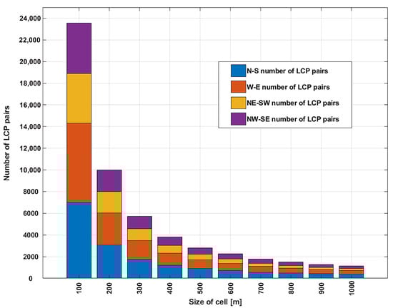 Number of LCP pairs at four different spatial directions as a function of cell size, .