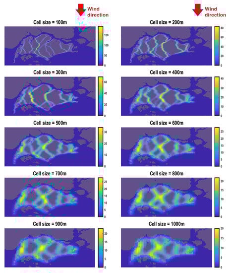 We study the sensitivity to cell size; the question of interest is: does the choice of the size of the cell (i.e., ) have an impact on the results of the analysis, and to what extent? This question is also related to the computational complexity of the algorithm, as we saw in Section 4. We investigate the sensitivity to cell size by running the model for various values where, for simplicity, we set . In Figure 10, we present the N–S wind corridors for m. The results show that increasing the cell size reduces the level of detail. This makes sense, since the larger the cell size, the more we average the information in order to calculate the FAI values. One should interpret this result jointly with the computational time presented earlier and make an informed decision regarding the spatial resolution and time complexity trade-off that works best for their purposes.