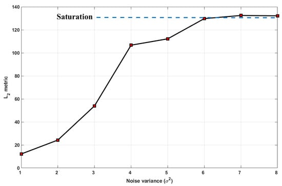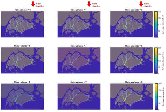 where N is the number of MC samples and is the n-th realization from the distribution presented in Equation (14). Samples from this density can be generated easily using a rejection mechanism from importance sampling [42]. The MC estimator is an unbiased estimator since the expected value of is equal to and, according to the strong law of large numbers, the average converges almost surely to the true expected value [42]. In Figure 11, we present the N–S wind corridors for m, where we vary the noise levels, , and set the number of MC samples, . The results show that, up to noise values of , the impact is quite small, and that for values larger than that, some of the details are lost. We further quantify this effect by comparing the distance between the noiseless case (e.g., ) with the other eight noisy scenarios. The results are depicted in Figure 12 and show an increase in the distance of the metric, which saturates at .