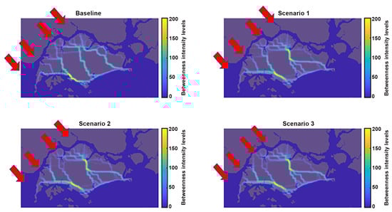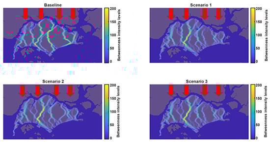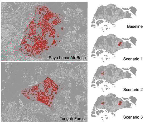 To demonstrate how our model can be applied in the real world, we develop some “what-if” scenarios (WiS) for Singapore. We select large open spaces that are currently planned for future development, such as Paya Lebar Airbase District (PLAB) on the northeastern side of the island, and Tengah forest, located at the west side; see Figure 13. The buildings are copied from the existing district, namely the Central Business District (CBD), known as one of the densest built-up areas of the city. Next, we then increase the built-up areas in each of these districts. First, we take the baseline case and copy the CBD buildings onto the PLAB district only, and Tengah area only, in Scenarios 1 and 2, respectively. Lastly, for Scenario 3, we combine both Scenarios 1 and 2 so that the built-up density is high in both selected districts. These scenarios, however, were created solely for testing purposes, without any intention to be a sort of recommendation for future urban design and planning. Then, we cross-compare these WiS against the baseline scenario, which closely reflects the current state of the island.