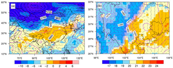 The atmospheric circulation at 15:00 UTC on 21 July 2019: (a) 500 hPa; (b) 850 hPa. The purple contour is the isobaric line (unit: gpm). The color scale indicates temperature (unit: °C).