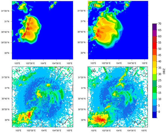 Radar reflectivity was observed and simulated at 14:00 UTC (a,c) and 15:00 UTC (b,d) on 21 July 2019: (a,b) simulation; (c,d) observation. The black line is the position of the vertical section line.