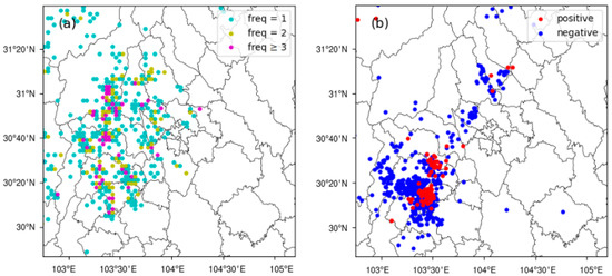 Six-hour lightning data: (a) simulation: the dots of freq = 1, freq = 2, and freq ≥ 3 indicate that the sum of intracloud and cloud-to-ground lightning frequency per minute is equal to 1, equal to 2, and greater than or equal to 3; (b) observation: the dots of positive and negative indicate positive and negative cloud-to-ground lightning.