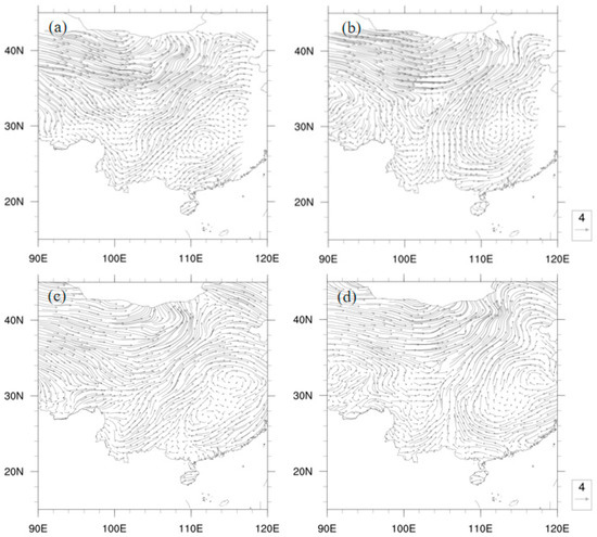 The wind field environment of 500 hPa was simulated and observed at 12:00 UTC (a,c) and 18:00 UTC (b,d) on 21 July 2019: (a,b) simulation; (c,d) observation.