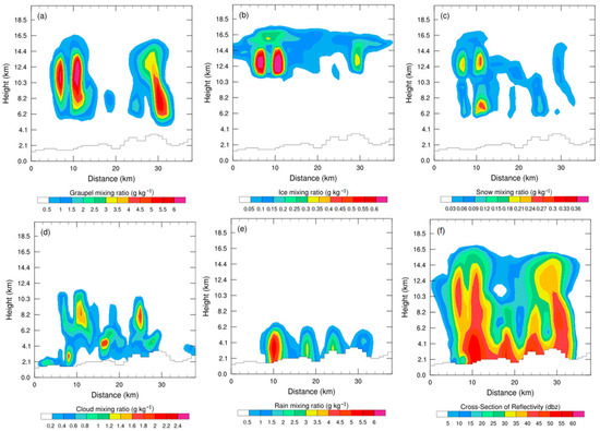 Vertical cross-section of the mixing ratio of particles at 14:00 UTC: (a) the mixing ratio of graupel particles; (b) the mixing ratio of ice crystal; (c) the mixing ratio of snow particles; (d) the mixing ratio of cloud droplets; (e) the mixing ratio raindrops; (unit: g·kg−1); (f) the radar reflectivity (unit: dBZ).