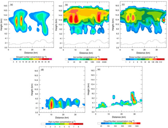 Figure 6 shows the vertical profile of hydrometeor number concentration at the same time and location in Figure 5. The number concentration of graupel particles (Figure 6a) is generally distributed from 7 to 16 km and the center of vertical distribution altitude is about 12 km with a maximum value of 45.16 g−1. The shape and distribution height of the number concentration of the ice crystals (Figure 6b) and snow particles (Figure 6c) are greatly similar in the vertical direction. The number concentration vertical distribution of ice crystals and snow particles is mainly at the altitude of 10 to 16 km, there are also at 6 to 10 km, where the particle number concentration is generally lower. The number concentration of snow particles is much lower than that of ice crystals, and the maximum values of both particles are 26,496.3 g−1 and 447.29 g−1, respectively. The vertical distribution altitude of raindrops (Figure 6d) is below 6 km with a maximum number concentration of 7.91 g−1. The distribution altitude of cloud droplets (Figure 6e) is generally below 8 km with a maximum number concentration of 1905.93 mg−1, and it is significantly higher at the altitude of 6 km than at other regions, this indicates that a strong updraft transports cloud droplets to higher altitudes with stronger convective activity.