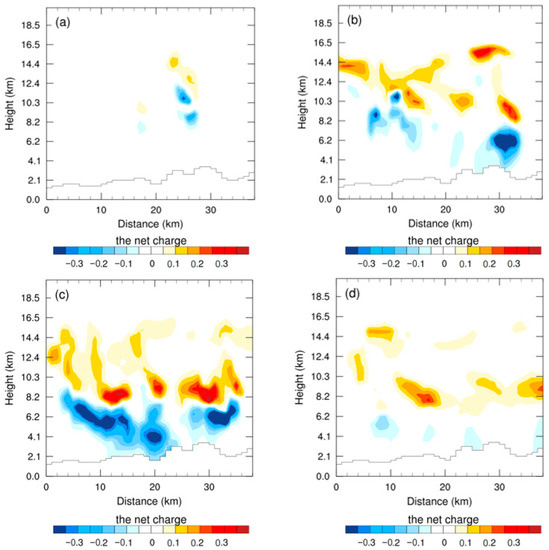 The net charge density vertical section: (a) 13:00 UTC; (b) 14:00 UTC; (c) 15:00 UTC; (d) 16:00 UTC, in nC m−3.