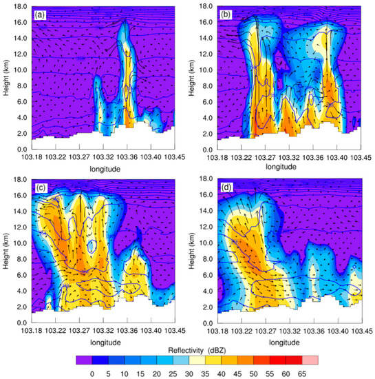 At the beginning of the thunderstorm cell generation stage (Figure 9a), the strong radar echo area is the core area of the strong updraft below 12 km. The pseudo-equivalent potential temperature, which is the potential temperature after all the water vapor condenses and falls [42], changes significantly with the updraft. In the vigorous developing stage (Figure 9b), the radar echo height increases to more than 16 km, and the strong echo area is also affected and gets to 12 km with the increase in the updraft. In the mature stage of the thunderstorm cell (Figure 9c), the distribution height of strong echo rises from 6 to 14 km by the influence of the updraft. The maximum reflectivity of radar echo is larger than 45 dBZ, and there is a certain downdraft under the thunderstorm cell. The simulated output indicates that a large number of charged hydrometeors fall into the cloud to produce precipitation in the mature late stage of the thunderstorm cell. In the extinction stage of the thunderstorm cell (Figure 9d), the radar echo top height decreased significantly with the velocity decreasing of updraft and downdraft.
