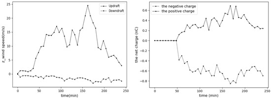 The evolution of maximum vertical wind speed (left) and net charge (right) with time.