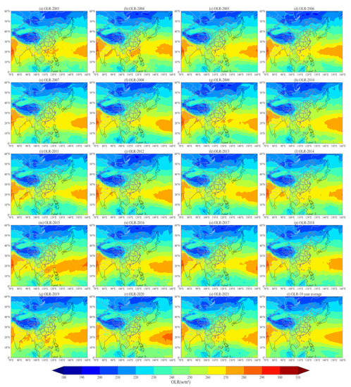 3.1.1. Year-By-Year Spatial Distribution of OLR in the Past 19 Years and 19-Year Average