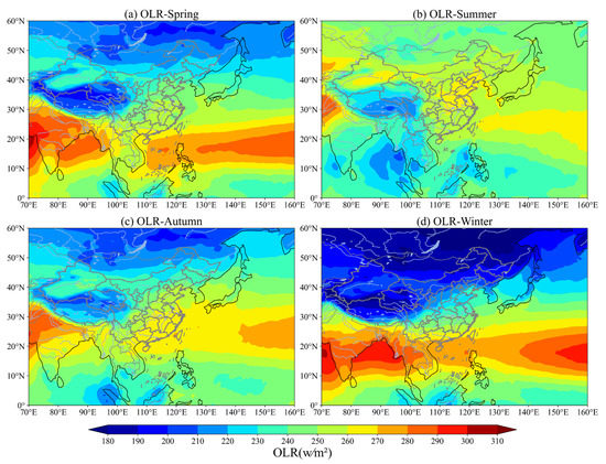 Seasonal spatial variation distribution of OLR in East Asia in the past 19 years.