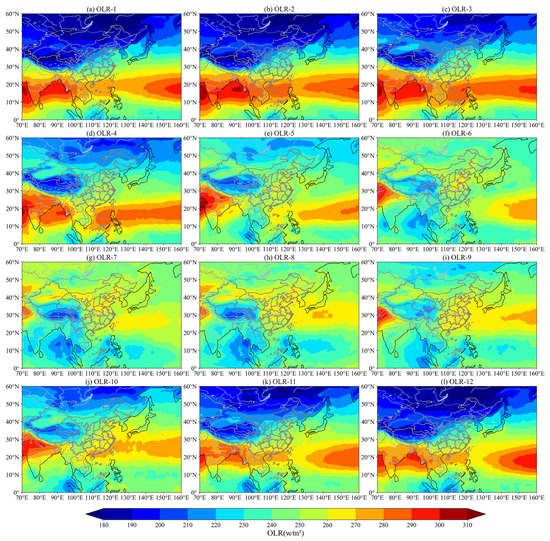 As shown in Figure 3, it is found that the OLR spatial distribution in May–October is higher than in other months. The possible reason is that from May to October, including summer, the end of spring and the beginning of autumn, the temperature is relatively higher, making the OLR at a high value. This may indicate that the OLR spatial distribution in East Asia has a great correlation with air temperature. Although the OLR value from May to October is higher than in other months, the division of high and low-value areas is not obvious, while in other months, the high- and low-value areas are at 10~30° N and 40~60° N, which means that in other months, the OLR value obviously decreases with the increase in latitude. According to the division of the natural year, it can be found from Figure 3 that OLR in spring and autumn has remained basically unchanged in East Asia. In summer, the range of 10–30° N latitude gradually decreases and the range of high-value areas gradually decreases, while other latitudes gradually increase, while the change in 10–30° N latitude in winter is just opposite to that in summer. This is most likely because the latitude range of 10~30° N is close to the equator, and the cloudiness near the equator obscures the propagation of OLR. At the same time, we know that a higher temperature causes higher water vapor and higher cloudiness, and a lower temperature, less water vapor and less cloudiness. This leads to opposite trends in summer and winter.