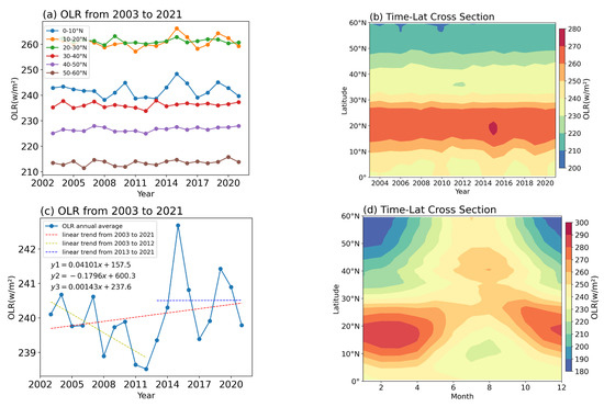 OLR multi-dimensional and multi-angle analysis. (a) Time-series changes of the same longitude and different latitudes. (b) Year time and latitude changes. (c) Time-series changes in special areas. (d) Monthly time and latitude changes.