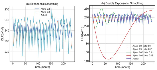 Figure 5a shows the single-exponential smoothing results. From Figure 5a, it can be seen that the actual monthly data change of OLR is the light-blue line, while the orange and dark-blue lines represent results obtained when different α values are taken. We found that when α = 0.2, the time-series change value of OLR has a large error compared with the actual value, which indicates that the test value cannot keep up with the change trend of the actual value and the fluctuation is relatively small; so, the time-series comparison is smooth. When α = 0.8, the test result can be close to the true value. However, the obtained α value is relatively large, indicating that the real-time sequence has a strong trend change and this method cannot be used for prediction. Figure 5b is the result of the double-exponential smoothing method. Based on the single-exponential smoothing method, an additional β value is added, compared with the single-exponential smoothing method that only considers the previous K historical data and static values. The double-exponential smoothing method “averages” historical data and also takes into account the upward trend of current data changes, which is the result of the interaction between α and β. From Figure 5b, it can be known that the purple line is the actual OLR change. The rest are the time series that approximates the actual value obtained under the action of different α and β. When α = 0.9 and β = 0.02, it can better approach the change of the actual value; and the deviation of α = 0.02 and β = 0.02 from the actual value is the most obvious. At the same time, under the action of the same α and different β, if α is small, no matter how large β is, it cannot be very close to the actual value. When α is large, no matter what value β takes, it can better fit the actual value. Meanwhile, the β value is smaller, the closer it is to the actual value, indicating that α occupies the main influence on the double-exponential smoothing method. Therefore, in order to get the result closer to the actual value, you can set α to be larger and β to be smaller; otherwise, it will not fit well.