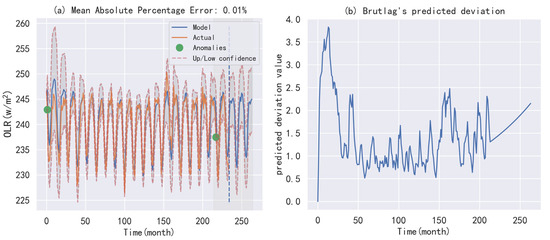 Figure 6a shows the prediction results of the triple-exponential smoothing. The triple-exponential smoothing adds a seasonal trend analysis to the double-exponential smoothing; in addition, the seasonality is used to explain the repeated changes of the intercept and trend, and is described by the length of the season. In this article, we take the seasonal step size as 24. It can be seen from Figure 6a that both the actual value and the predicted value can satisfy the confidence interval. In addition, it is found that the prediction model results and the actual value results can be well fitted to approach the initial time series and capture seasonality. However, the overall downward trend has some anomalies. At the same time, the green dots are the unstable point in the whole time series. There are two outliers in the figure: one appears in the initial stage of the OLR time series and the other anomaly occurs at the end of the actual time series, indicating that in the prediction process, there will be interference at the beginning; and when it gradually stabilizes, the outliers will be such that it does not appear. Moreover, the time series will be affected by the white noise of the system and the results of human operation during the acquisition of atmospheric data factors when it is about to end. At the same time, from the model deviation diagram in Figure 6b, it can be found that the model responds very strongly to changes in the sequence structure at the beginning. However, the deviation will soon return to the normal value and “forget” the past, which indicates that the model has no memory function; in addition, the range of deviation is mainly between 0.5 and 2.5, and the deviation is small. Furthermore, from the prediction results in Figure 6a, it is found that the accuracy is higher and the error is smaller. The prediction results have a certain reference, indicating that the results can provide a reference value for future data research.