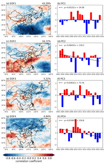 It can be found in Table 1 that the OLR value after EOF decomposition has a fast convergence speed, and the total modal variance contribution after decomposition exceeds 70%. The main information of the anomaly field is concentrated, which has high research significance. The variance contribution of EOF1 (Figure 7a) and EOF2 (Figure 7c) in Table 1 is much higher than that of the other two modes; so, only the first two modes with high contribution are analyzed here, and the latter two modes are analyzed similarly to the first two modal analyses. From Figure 7a, it can be seen from EOF1 that it is negative in the range of 0~25° N in East Asia, and has extremely low negative values in the range of 100~135° E, while Sichuan, Chongqing, and western parts of the Pacific Ocean are positive. At the same time, combined with the time coefficient principal component (PC)1 (Figure 7b), it can be found that the overall change trend of PC1 is a downward trend, indicating that the value of OLR in the range of 0~25° N and 100~135° E in East Asia shows an upward trend; and Sichuan, Chongqing, and parts of the western Pacific are on a downward trend. From Table 2, it can be seen that the time trend of the first 10 years and the last 9 years is an increase, indicating that the total OLR value decreased more than increased during the 19 years. It can be seen from EOF2 (Figure 7c) that positive values are found in South China, Southwest China, Taiwan, East China Sea, Southeast Asia, the Bay of Bengal, and South India; and extremely high-value areas appear in Guangdong, Fujian. However, the region of Northwest China, the Qinghai-Tibet Plateau, and some waters of the western Pacific showed negative values; and the negative values were more obvious in some waters of the western Pacific. At the same time, combined with the change of the time coefficient PC2 (Figure 7d), it is found that there is a downward trend in 19 years, indicating that the OLR values in Southwest China, Taiwan, the East China Sea, Southeast Asia, and the Bay of Bengal have a decreasing trend. Moreover, northwest China, the Qinghai-Tibet Plateau, and parts of the western Pacific Ocean show an increasing trend. From Table 2, we can find that the changing trend of the first 10 years and the last 9 years is also decreasing, which shows that the changes of the first 10 years and the last 9 years are the same as the changes of the whole 19 years. At the same time, it can be seen through PC2 that the first 5 years are all positive, indicating that the change in the first 5 years is the opposite of the overall change in the first 10 years and the last 9 years. In addition, after 2008, the time coefficient is a negative value and reduced the amount of OLR more than in the previous 5 years, ultimately leading to a downward trend in the change over 19 years.