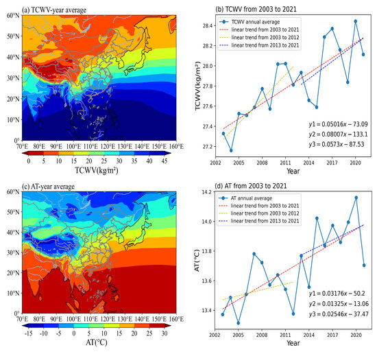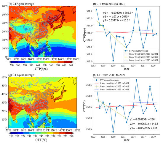 Figure 8a,c,e,g shows the multi-year spatial distribution of TCWV, AT, CTP, and CTT. Figure 8b,d,f,h for the inter-annual variation. From the spatial distribution of Figure 8a,c, it can be found that the spatial distribution of TCWV and AT are basically the same. It is in the high-value area between 0 and 25° N, and mostly in the ocean area, while the lower-value area is located in the Qinghai–Tibet Plateau. From the spatial distribution of CTP and CTT in Figure 8e,g, it can be seen that the high-value areas of CTP appear in northeastern China, South Korea, and North Korea; and the low-value area is in the range of 0~10° N. At the same time, it can be found that the Qinghai-Tibet Plateau is the lower-value area in the whole of China, and the spatial distribution of CTT and CTP is relatively similar; but, the high-value area of CTT is in India and the CTP is different. Figure 8b shows the inter-annual variation of TCWV. It can be seen that the inter-annual variation of TCWV shows an upward trend, and it also increases with different slopes in the first ten years and the next nine years; but, there is a downward trend in the process of increasing from 2010 to 2015. This may be caused by the upward trend of OLR during this period. Figure 8d shows the inter-annual variation of AT. This trend is similar to the variation trend of TCWV, both of which are increasing, and there is also a decreasing trend from 2007 to 2012. At the same time, among the inter-annual changes in the past 19 years, it reached the maximum value in 2020. It can be seen from Figure 8f,h that CTP and CTT have similar changing trends. However, the overall trend of CTP is decreasing, and the trend of CTT is increasing. In addition, the changing trend in the next nine years is also the opposite. At the same time, both reached the lowest values in 2008, which were 515 hpa and 251 °C.