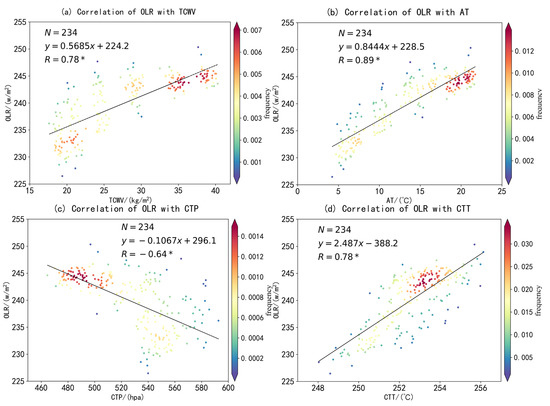 4. Relationship between OLR and TCWV, AT, CTP, and CTT