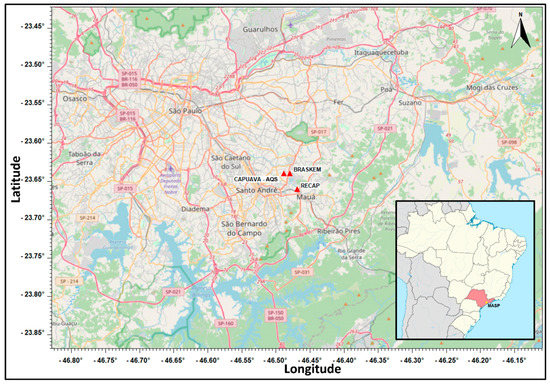 Metropolitan area of São Paulo (MASP) with Braskem and RECAP industries, and the CETESB, Capuava Air Quality Station, and AQS (identified by the red triangles). Source: OpenStreetMap.