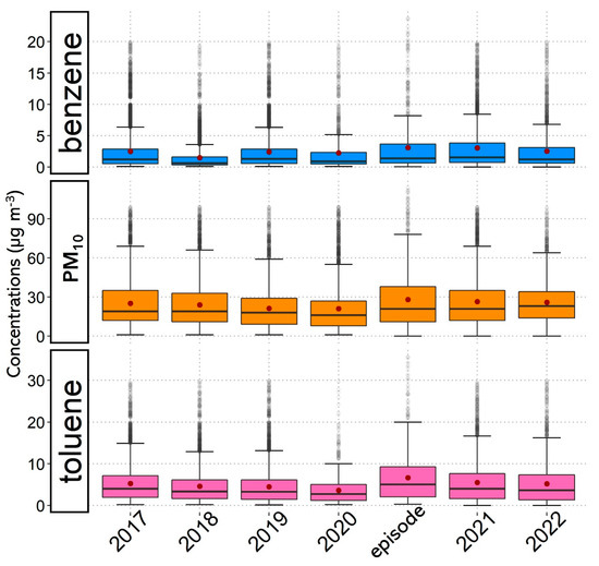 Annual boxplots of 1 h concentrations (µg m−3) for PM10, benzene, and toluene at Capuava AQS, from 2017 to 2022, and for each episode. Boxplot width and the lower and upper hinges correspond to the first and third quartiles (the 25th and 75th percentiles). Lower whisker: smallest observation greater than or equal to lower hinge—1.5 * IQR (interquartile range), above 75th percentile. Upper whisker: largest observation less than or equal to upper hinge + 1.5 * IQR, below 25th percentile. The middle is the median (50% quantile), and the red point is the mean value. Points beyond the end of the whiskers are “outliers”, which correspond to values > 1.5 and <3 times the standard deviation (sd). The data were presented on the Y axis with an appropriate scale for good visualization of the percentiles and the mean in relation to the median. Obs.: The episode corresponds to April–May of 2021, 2021 corresponds to the other months of this year, the data available for 2020 were only from January to March, and 2022 was only from January to June.
