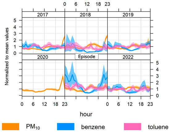 Normalized concentrations in relation to the mean value profiles for PM10, benzene, and toluene at Capuava AQS, from April to May for each year from 2017 to 2022. Episode represents the 2021 concentrations.