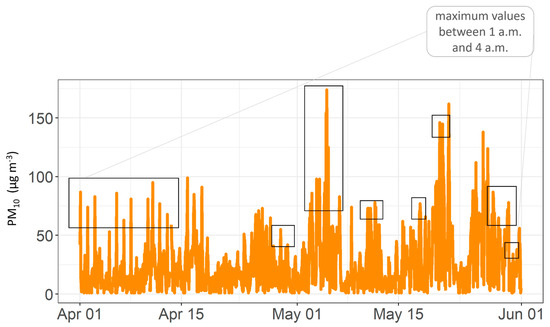 Hourly concentrations of PM10 at Capuava AQS, during the episode (April to May 2021). Rectangles represent the peaks observed from 1:00 a.m. to 4:00 a.m.