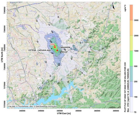 The pollutants’ dispersion provided by AERMOD is shown in Figure 7 and Figure 8. The maximum concentration of the 1 h average of VOC (3.753 µg m−3, 23°37′58.59″ S, 46°29′2.37″ W) is highlighted in Figure 7, during April and May of 2021. It is very important to observe that this highest VOC value modeled by AERMOD happened, practically, inside the CPC area. Therefore, when observing the dispersion of the plume, it could be verified that the residential area was exposed to concentrations that varied from 75 to 500 µg m−3 (areas in different shades of blue in Figure 7). These values are consistent with the event observed by official air quality monitoring [6] and are compatible with the levels of odor perception [62]. The plume of 75 µg m−3 concentration reached areas from 8 to 19 km away from the complex, and the plume ranging from 250 to 1000 µg m−3 reached the nearest areas, about 3 km away.