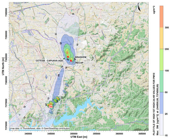 The PM isolines showed the 396 µg m−3 maximum 24 h average concentration, (23°43′26.30″ S, 46°31′31.37″ W) which occurred 10 km southwest from CPC (Figure 8). The plume ranging from 100 to 200 µg m−3, with second maximum concentration of the 300 µg m−3, reached areas closer to the sources, about 2 km away.