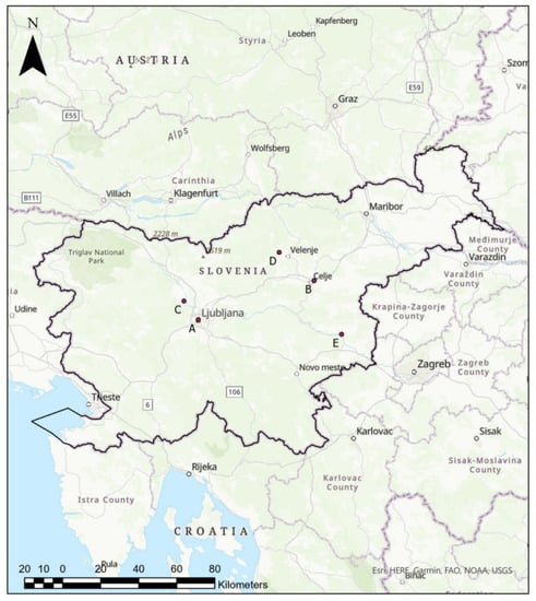 - Bec, D.; Ciglenički, D.; Dolšak Lavrič, P.; Gjerek, M.; Koleša, T.; Logar, M.; Matavž, L.; Murovec, M.; Rus, M.; Žabkar, R. Kakovost Zraka v Republiki Sloveniji v Letu 2021; Agencija Republike Slovenia za Okolje: Ljubljana, Slovenia, 2021. Available online: https://www.arso.gov.si/zrak/kakovost%20zraka/poro%C4%8Dila%20in%20publikacije/kakovost_letna.html (accessed on 8 March 2023).