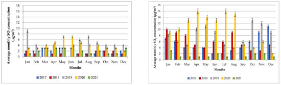 Figure 4 shows average monthly NO2 concentrations at studied locations throughout the years. Average monthly NO2 concentrations at location A were 111.92 ± 5.97 µg/m3 in 2017, 34.00 ± 1.70 µg/m3 in 2018, 41.08 ± 2.05 µg/m3 in 2019, 35.16 ± 1.76 µg/m3 in 2020, and 32.83 ± 1.64 µg/m3 in 2021. The highest average monthly SO2 concentration was in the year 2017 (189.00 ± 9.45 µg/m3), whereas the lowest was in the year 2018 and 2019 (0.00 ± 0.00 µg/m3). In 2017, the highest average monthly concentration was detected in December (189.00 ± 9.45 µg/m3), whereas the lowest average monthly concentration was detected in July (59.00 ± 2.95 µg/m3). In 2018, the highest average monthly concentration was detected in February and March (62.00 ± 3.10 µg/m3), while the lowest average monthly concentration was detected in July, August, and September (0.00 + 0.00 µg/m3). Average monthly SO2 concentrations at location B were 22.08 ± 1.10 µg/m3 in 2017, 17.08 ± 0.85 µg/m3 in 2018, 13.92 ± 0.69 µg/m3 in 2019, 7.16 ± 0.36 µg/m3 in 2020, and 15.67 ± 0.78 µg/m3 in 2021. Average monthly NO2 concentration at location B was the highest in the year 2017 (40.00 ± 2.00 µg/m3), whereas the lowest was detected in the year 2020 (0.00 ± 0.00 µg/m3). In 2017, the highest average monthly concentration was detected in January (40.00 ± 2.00 µg/m3), whereas the lowest average monthly concentration in that year was detected in June and July (13.00 ± 0.65 µg/m3). In 2020, the highest average monthly concentration of 22.00 ± 1.10 µg/m3 was detected in January, whereas during other months, the average monthly concentration varied from 0.00 ± 0.00 µg/m3 to 17.00 ± 0.85 µg/m3. Average monthly NO2 concentrations at location D were 7.00 ± 0.35 µg/m3 in 2017, 21.00 ± 1.05 µg/m3 in 2018, 13.42 ± 0.67 µg/m3 in 2019, 15.08 ± 0.75 µg/m3 in 2020, and 13.58 ± 0.68 µg/m3 in 2021. The highest average monthly NO2 concentration was in 2017 (30.00 ± 1.50 µg/m3), whereas the lowest was in the year 2019 (5.00 ± 0.25 µg/m3). In 2017, the highest average monthly concentration was detected in May (30.00 ± 1.50 µg/m3), the lowest average monthly concentration was detected in September that year (14.00 ± 0.70 µg/m3). In 2019, the highest average monthly concentration was detected in January and February (16.00 ± 0.80 µg/m3), and the lowest average monthly concentration was detected in May (5.00 ± 0.25 µg/m3). Average monthly NO2 concentrations at location E were 6.58 ± 0.32 µg/m3 in 2017, 6.67 ± 0.33 µg/m3 in 2018, 4.83 ± 0.24 µg/m3 in 2019, 5.17 ± 0.26 µg/m3 in 2020, and 5.58 ± 0.28 µg/m3 in 2021. The highest average monthly NO2 concentration was in the year 2017 (14.00 ± 0.70 µg/m3), whereas the lowest was in the year 2019 and 2021 (2.00 ± 0.10). Again, the highest average monthly concentrations of NO2 were detected in January, December, and February, whereas the lowest average monthly concentrations were detected during summer months.