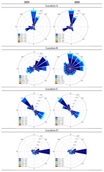 Meteorological data were studied in details between the years 2019 and 2020 to better understand the impact of metrology on the concentration levels of studied air pollutants. According to the meteorological data, the mean annual average temperature in 2019 on location A was 12.66 ± 0.63 °C, on location B 12.61 ± 0.63 °C, on location C 12.14 ± 0.61 °C, on location D 11.62 ± 0.58 °C, and on location E 22.33 ± 1.12 °C. The average annual relative humidity (RH) was 65.94 ± 3.29%, 78.46 ± 3.92%, 80.91 ± 4.05%, respectively. In the year 2020, the average annual temperature was 12.21 ± 0.61 °C, 12.04 ± 0.60 °C, 11.65 ± 0.58 °C, 10.76 ± 0.53 °C, and 23.50 ± 1.18 °C, respectively, at each location, whereas RH was 64.25 ± 3.21%, 77.08 ± 3.85%, 80.41 ± 4.02%, respectively. On location C and E, RH was not monitored during the studied years. In SM, Figure S6 shows the plots of temperature and RH for studied years at each location. Moreover, Figure 12 shows wind roses for each location and each studied year. As stated in our previous work [14], the wind conditions in the RS are influenced by its varied relief, location, and the Alps. Normally, the wind blows from a westerly direction. Compared to Western Europe, the RS is not as windy, as it is located in the lee of the Alps [3]. Average wind speeds at location A were 1.30 ± 0.07 m/s in 2019 and 2020, at location B were 1.70 ± 0.85 m/s in 2019 and 2020, at location C were 0.90 ± 0.05 m/s in 2019 and 1.00 ± 0.05 m/s, and at locations D and E were 1.50 ± 0.08 m/s in 2019 and 2020. During both years, north-east winds dominated location A, east winds dominated location B, north-west winds dominated location C, and east winds dominated both locations D and E. Based on these findings, it can be concluded that changes in temperature, relative humidity, wind speed, and wind direction were negligible at all locations during both studied years (<5%).