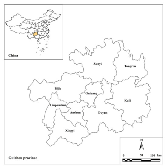 Guizhou province is located in southwestern China between 103°31′–109°30′ E and 24°30′–29°13′ N, with a total area of 176,167 km2 (Figure 1). The province has complex landforms, a typical climate and abundant biodiversity. In Guizhou Province, P. sinensis forests are mainly distributed in the Bijie (Weining county), Zunyi (Meitan county and Tongzi county) and Tongren regions (Songtao county and Dejiang county), among which the Bijie region (Weining county) occupies the largest area [3].
