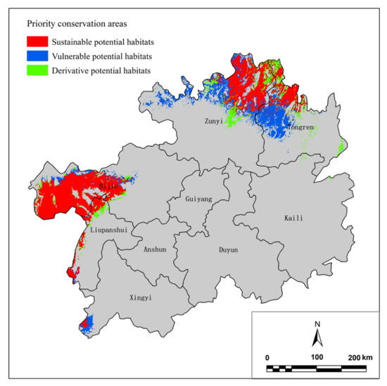The total area of priority conservation areas under climate change was 25,350.26 km2. Sustainable potential habitats covered the largest area (15,075.96 km2) among the three types of priority conservation area, and were mainly distributed in Bijie (7612.44 km2) and Zunyi regions (4481.32 km2). Subsequently, vulnerable potential habitats were mainly distributed in the Zunyi (3147.95 km2) and Tongren regions (2650.73 km2), with a total area of 7256.59 km2. Derivative potential habitats had the smallest area, were mainly distributed in Zunyi (1312.90 km2) and Tongren regions (1021.40 km2), with a total area of 3017.71 km2.