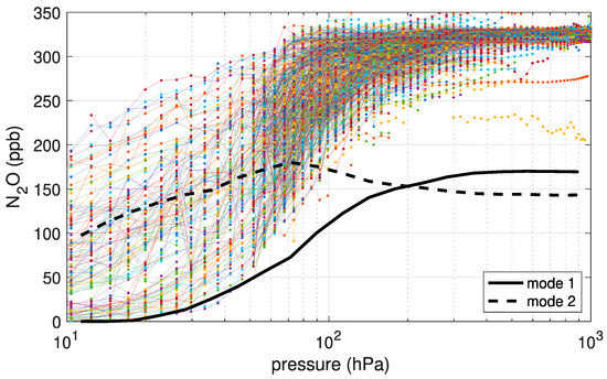 N2O mole fraction (in volume mixing ratios with units of parts per billion) versus pressure for all the observations after rebinning all the concentrations onto the same pressure grid. Also shown are the two modes obtained by blind source separation with arbitrary amplitudes.
