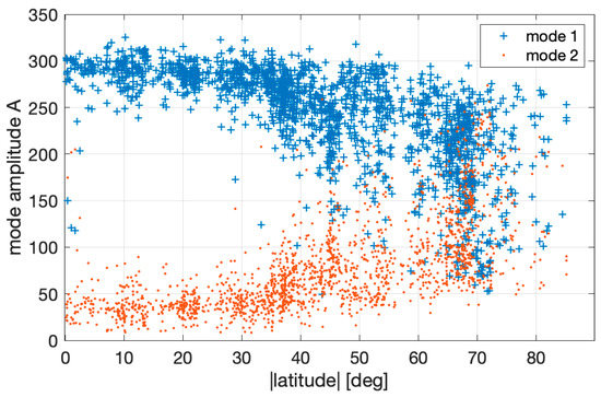Latitudinal dependence of the amplitude A of modes 1 and 2. The latitude is the median latitude during the profile.