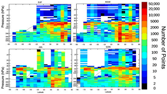 Number of measurements per 10° latitude grid box and 60 levels pressure (600–5 hPa) for all years and seasons: December-January-February (DJF), March-April-May (MAM), June-July-August (JJA), and September-October-November (SON). The dashed black line represents the tropopause pressure according to ECMWF ERA-interim [48].