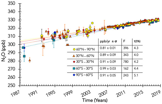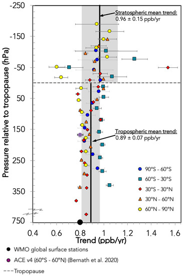 Figure 6 shows the trend of N2O in ppb per year for all data selected between 1987 and 2018 according to the latitude bands: North and South Polar regions (±[90–60]° N), northern and southern midlatitudes (±[60–30]° N) and tropics (±30°). The vertical axis represents the altitude in pressure relative to the pressure at the tropopause. The tropopause pressure according to latitude has been determined from studies of ERA-interim data from ECMWF [48]. The error bars represent the standard deviation of the slope for the plot concentration versus time (see, e.g., Figure 5). The trends range between 0.8–1.1 ppb/yr in the upper troposphere (up to 350 hPa greater than the tropopause pressure) and 0.64–1.20 ppb/yr in the lower stratosphere (up to 150 hPa less than the tropopause pressure). The data in the stratosphere show more uncertainty, as illustrated by the larger error bar in this part of the atmosphere. Indeed, fewer measurements are available in the stratosphere compared to the troposphere. The average trend is 0.89 ± 0.07 ppb/yr (1σ) in the upper troposphere and 0.96 ± 0.15 ppb/yr (1σ) in the lower stratosphere. Taking into account the uncertainties (one sigma), the difference in the two trends is insignificant. The trend in the southern midlatitude (60–30° S) band seems larger than the others, most visible for pressures relative to the tropopause up to 150 hPa. However, it is important to note that the southern midlatitudes are the least sampled, so lower statistics may also contribute to this difference in the trend.