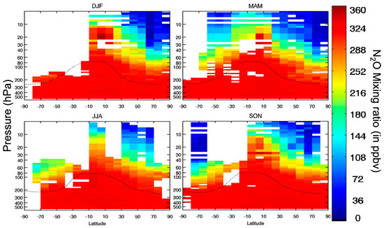N2O mixing ratio zonal mean in 2018 (the trend observed in Figure 5 applied to the data) for December-January-February (DJF), March-April-May (MAM), June-July-August (JJA), and September-October-November (SON). Zonal means are calculated from error-weighted measurements (see Section 2.3) with 10° latitude bins and 60 levels of pressure (from 600 hPa to 5 hPa). The dashed line represents the tropopause pressure according to ECMWF ERA-interim [48].