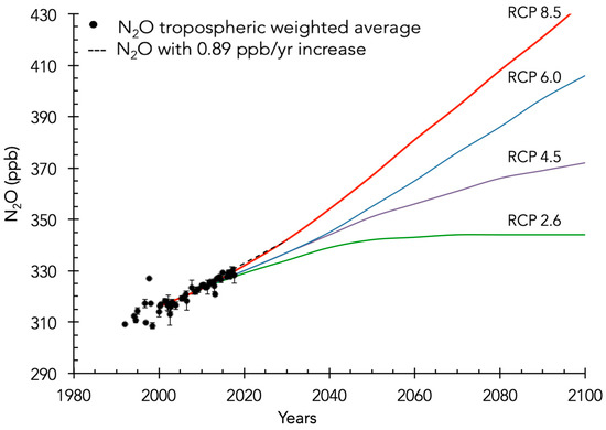 With the decrease in halocarbon concentrations, N2O emissions will become the primary ozone-depleting substance in the future [6]. However, the impact of N2O depends on the levels of CO2 and, to a lesser extent, CH4 [57,58]. The reactivity of N2O depends largely on the temperature of the stratosphere, and increasing CO2 (and CH4) cools the stratosphere [59]. Therefore, it is difficult to quantify the impact of increasing N2O on ozone depletion without accounting for CO2 and CH4. Figure 8 shows the concentration of N2O in the troposphere between 1987 and 2018 from aircraft and balloon measurements from our study and from Representative Concentration Pathways (RCP) scenarios [60]. The N2O concentration with an increase of 0.89 ppb/yr (as observed in the troposphere in our study) is also shown. If N2O emission levels remain constant, the concentrations follow the RCP 6.0 or 8.5 scenarios. According to the study by Revell et al. [58] (in Figure 1), the CO2 and CH4 levels with the RCP 6,0 scenario result in ozone depletion potentials (ODP) of 0.019 for N2O and, therefore, comparable potential as the actual ODP (0.017) as suggested by [6]. Only the anthropogenic emissions part is controllable, and most of this comes from fertilizers used in agriculture, which are difficult to substitute. Models can address the question of the anthropogenic component of the observed N2O increase. In addition, climate change may also affect the natural part of the emissions, which is difficult to predict.