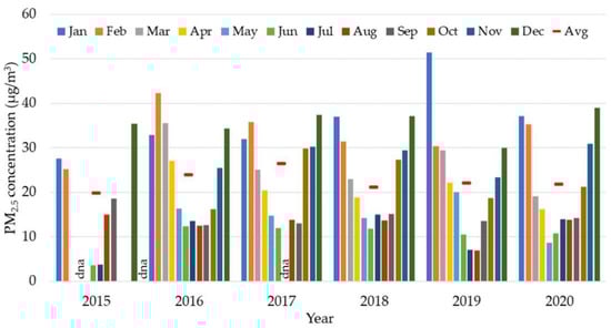 Analysis of month-by-month PM2.5 averages over the investigated period (2015–2020) shows that the mass concentrations in January, February, March, November, and December exceeded the Thai national annual PM2.5 standard (25 µg/m3), and the best air quality was recorded in June–August. Based on the new annual PM2.5 standard (15 µg/m3), the air quality from 2015 to 2020 met the permissible requirements during the period from May to September, except in the year 2019. PM2.5 concentrations exceeded the current short-term standard (50 µg/m3 within 24 h) in January 2019, consistent with earlier findings [34].