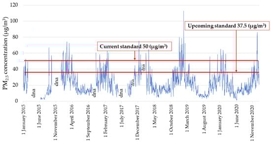 Some data for the years 2015 and 2017 were unavailable due to equipment maintenance and are denoted as “dna” or “data not available” in Figure 2. These only negligibly impacted the ML process. The overall morphology of data distribution (Figure 2) shows a typical U-shaped form for Southeast Asia, with the lowest ambient PM2.5 concentrations recorded in July and August. Day-by-day PM2.5 concentration data from 2015 to 2020 (Figure 3) show that the current daily PM2.5 standard (50 µg/m3) was exceeded on 4 days in 2015, 28 days in 2016, 10 days in 2017, 10 days in 2018, 16 days in 2019, and 21 days in 2020. The upcoming daily PM2.5 standard of 37.5 µg/m3 was exceeded within 24 h on 18 days in 2015, 51 days in 2016, 42 days in 2017, 35 days in 2018, 38 days in 2019, and 52 days in 2020.