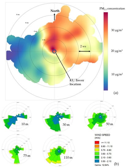 Polar plot of actual PM2.5 concentrations measured at 30 m (a), averaged over the years 2015–2020, and the corresponding wind direction and wind speed distribution measured at the KU tower at the indicated levels (b).