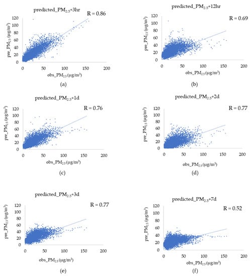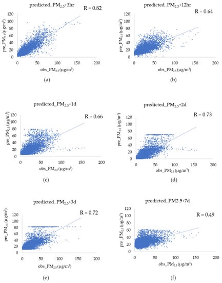 Quality of predictions (R) of PM2.5 concentrations for up to 7 days using multiple linear regression compared with observed PM2.5 data. Forward prediction for: (a) 3 h, (b) 12 h, (c) 1 day, (d) 2 days, (e) 2 days, (f) 7 days.