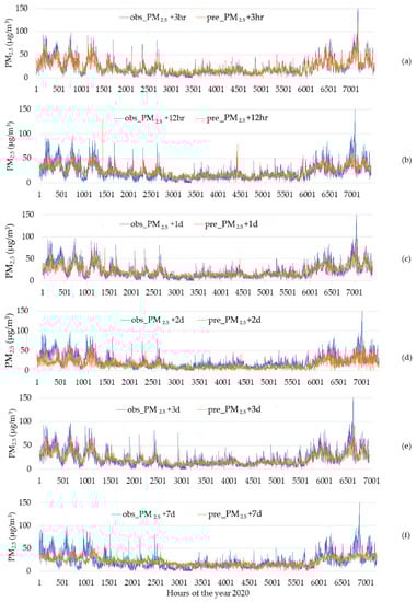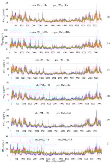 Variations between observed PM2.5 concentrations and PM2.5 concentrations predicted using the multilayer perceptron method. Forward prediction for: (a) 3 h, (b) 12 h, (c) 1 day, (d) 2 days, (e) 2 days, (f) 7 days.