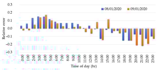 Relative error between predicted PM2.5 concentrations and those observed on 8 January and 9 January 2020, showing the accuracy of the developed method as a function of time.