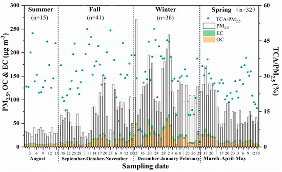 The daily mass concentrations of PM2.5, OC and EC and total carbonaceous aerosol (TCA) contribution percentage to PM2.5 are illustrated in Figure 2 and summarized by season in Table 1. The annual mean concentration of PM2.5 was 83.8 ± 48.7 μg m−3, with a range of 14.3~269.7 μg m−3, which was about 2.4-fold greater than the 2nd annual limit value (35 μg m−3) according to China National Ambient Air Quality Standard (NAAQS) (GB3098-2012). The seasonal mean PM2.5 concentration was the highest in winter (117.4 ± 47.6 μg m−3), followed by spring (79.2 ± 34.3 μg m−3) and fall (67.3 ± 34.7 μg m−3), and the lowest in summer (31.8 ± 6.5 μg m−3). Compared to 2009–2010 in Taiyuan, reported by He et al. (2015) [25], the PM2.5 concentration has dropped by 77%, 63%, 55% and 68% reduction in summer, fall, winter and spring. However, fine particle pollution in the present study was still relatively serious, especially in the heating seasons. It can be seen that only the summer PM2.5 concentration was within the first order ambient air quality standard daily limit (35 μg m−3) of MEPC while that in winter, spring and fall were about 3.4, 1.9 and 2.3 times that of the limit.
