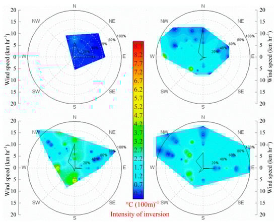 Seasonal wind roses with the intensity of atmospheric temperature inversion.