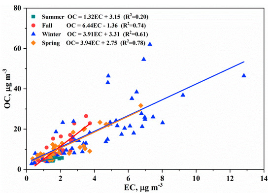 The OC/EC ratio can indicate the source of carbonaceous matter and its transformation information [21,25]. The mean OC/EC ratios were 3.5, 5.1, 5.2 and 4.8 in the four seasons (Table 1), representing the dominant emissions from gasoline and diesel vehicles in summer while coal and even biomass combustion in other seasons [36,37]. The current OC/EC ratios were in the ranges of those in the 14 Chinese cities reported by Cao et al. (2007) but much higher than those in Taiyuan (1.5~2.5) a decade ago [25]. Seasonal correlations between OC and EC in PM2.5 in Figure 4 may initially distinguish the main sources of carbon elements in the atmosphere and can partly reflect the relationship between both sources [38]. As shown, OC had high correlations with EC in spring (R2 = 0.78), fall (R2 = 0.74), and winter (R2 = 0.61), which indicates that they mainly came from similar sources. In spring, the low temperature and particulate, chemical activity, and weak secondary generation, and frequent dust storm pollution input could make the OC mass concentration more affected by the primary emission source.