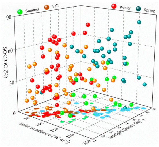 Seasonal SOC/OC percentage as a function of daily hours of sunlight and average solar irradiance during daylight hours.