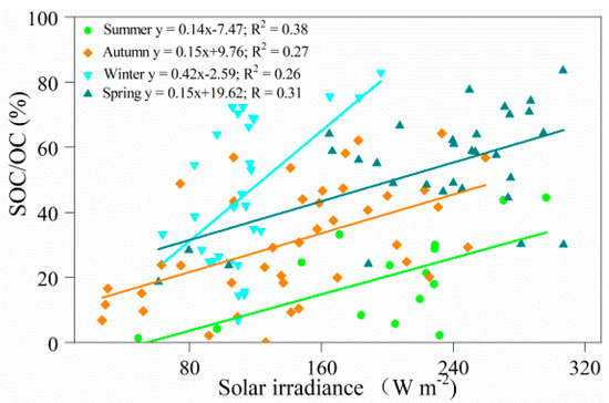 Scatter plots and linear regression equations of SOC/OC percentage vs. solar irradiance.